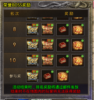 2. 活动开启后,地图内刷新一只荣誉BOSS,攻击BOSS可获得伤害值,活动结束根据对BOSS的伤害给予对应的排名奖励。